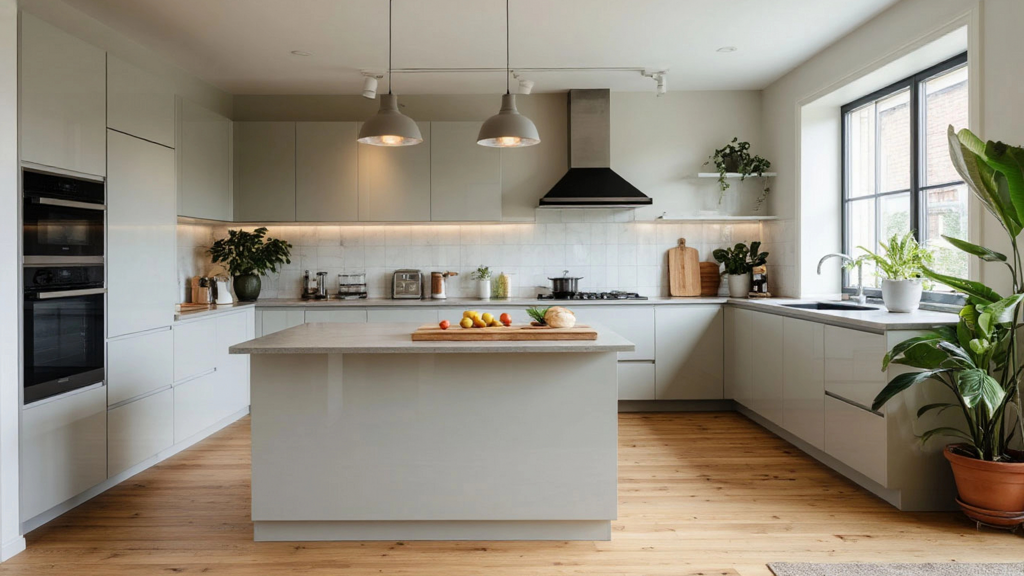 Современные технологии интегрированы в интерьер максимально ненавязчиво. Встроенная техника, посудомоечные машины и духовые шкафы гармонично скрыты за фасадами, сохраняя чистые линии и минималистичный вид. Подсветка рабочих зон, встроенные светильники и элементы LED-подсветки создают мягкий и равномерный свет, подчёркивая светлую цветовую гамму кухни и создавая атмосферу уюта и спокойствия. Эргономичные ручки и бесшумные системы открывания обеспечивают лёгкость использования и комфорт на каждый день.